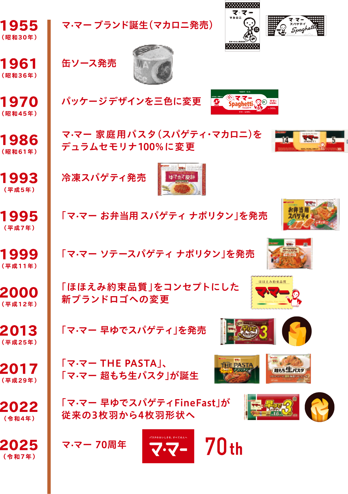 「マ・マー」ブランドは1955年に誕生し、本年で70周年を迎えます。ブランド誕生以来、変化する食のニーズにお応えし、パスタ(乾麺)、パスタソース、冷凍パスタ等の製品を提供することで、家庭用パスタのトップブランドとして広くご支持をいただいています。一方、消費者の価値観、生活スタイルは近年、大きく変化しており、この先も愛されるブランドであり続けるため、節目となる70周年を機にリブランディングすることとしました。